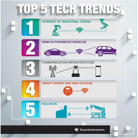 在迎接2015到來之際,我們有必要花時間來評估和預測未來的一年中將會出現的技術挑戰(zhàn)和突破創(chuàng)新。通過與眾多戰(zhàn)略客戶、大學合作伙伴以及TI產品線的技術專家進行探討后,我們認為TI將在一些重要技術趨勢中發(fā)揮戰(zhàn)略性作用。這些技術趨勢正推動著汽車和工業(yè)等多個市場的發(fā)展,而在此過程中,TI的工程師將幫助應對半導體技術領域的獨特挑戰(zhàn),并利用先進技術改善我們的生活。